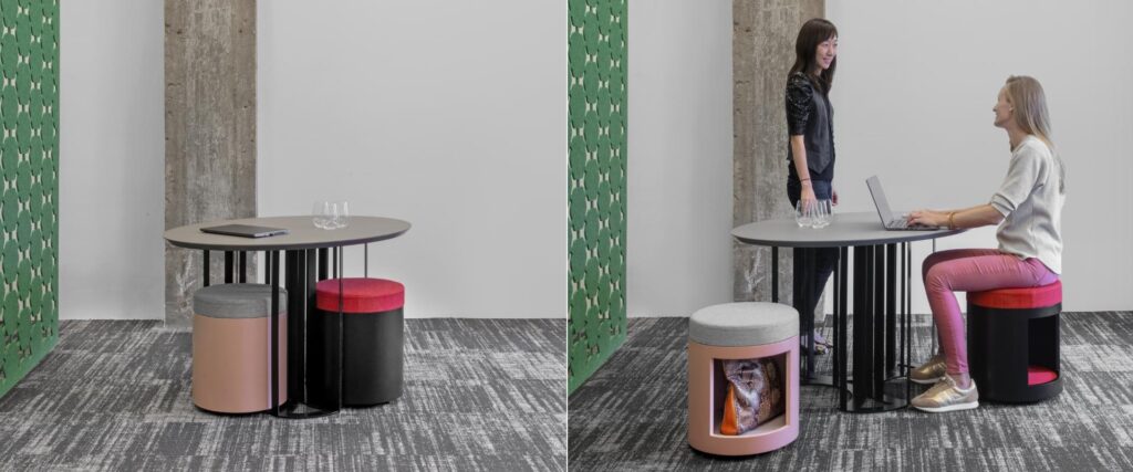 Dank seiner Multifunktionalität spart ZooZoo Platz, indem er eine Fläche, einen Sitzplatz und ein Aufbewahrungsfach in einer Einheit anbietet. Der Tisch beherbergt die Hocker unter der Arbeitsplatte und die Hocker haben eine Nische, in der Sie Ihre persönlichen Gegenstände unterbringen können.